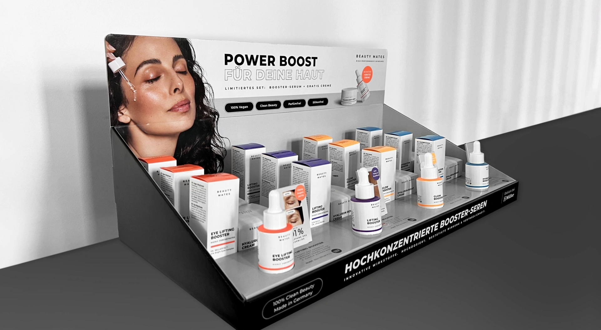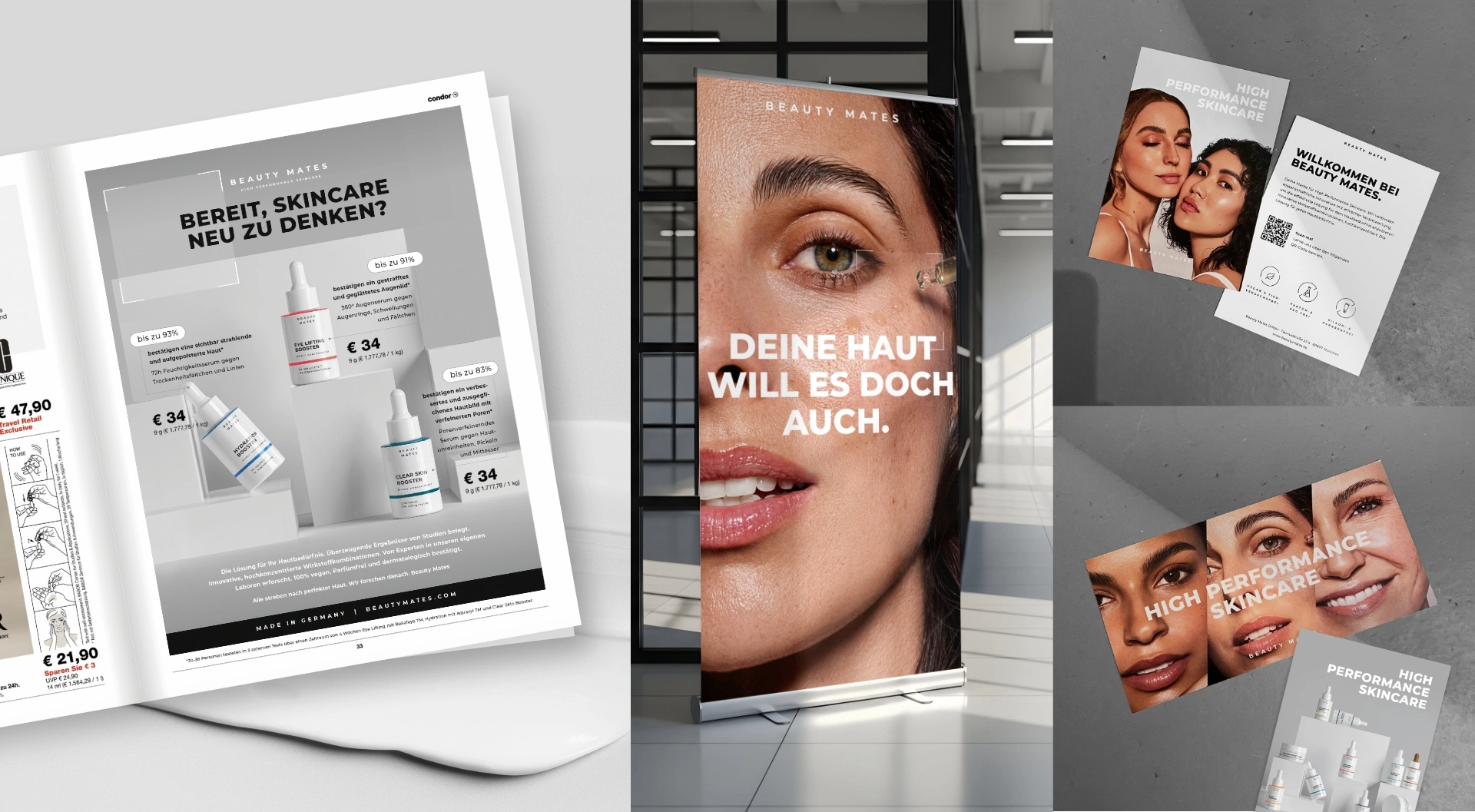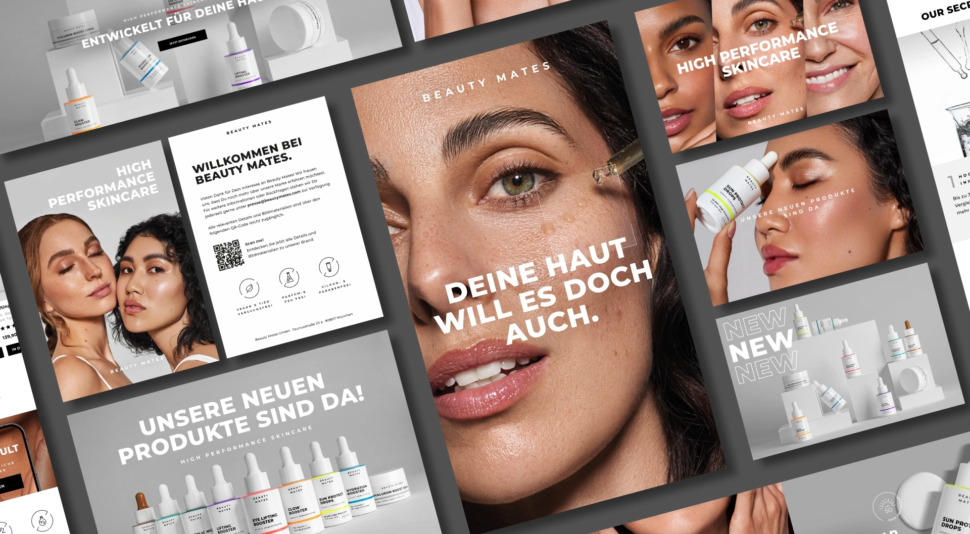 Entwicklung eines ganzheitlichen Rebrandings mit anschließendem 360° Brand- und Product-Relaunch für Beauty Mates mit dem Ziel, die visuelle Identität zu schärfen und die Marke klar im Bereich High Performance Skincare zu positionieren. Im Fokus stand der Aufbau einer konsistenten Markenwelt über alle relevanten Touchpoints hinweg – von Packaging und E-Commerce bis hin zu Kampagnen und POS.
