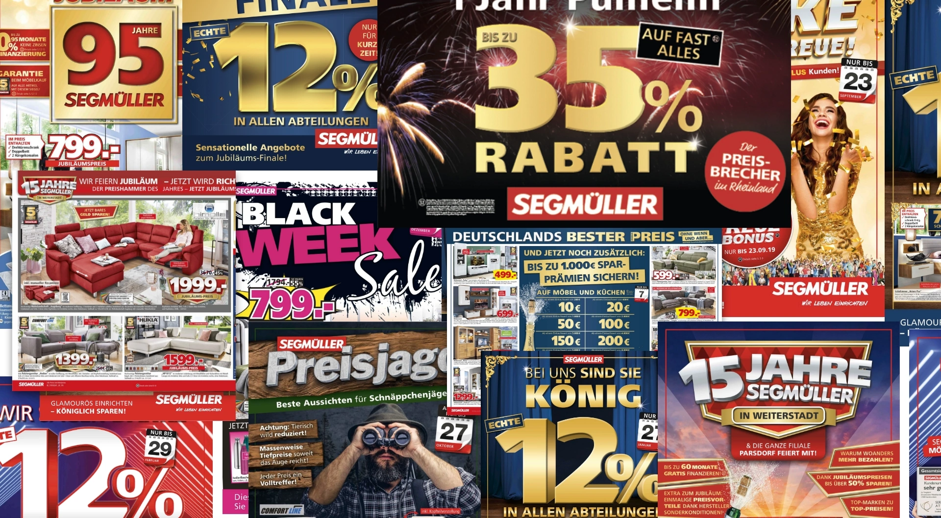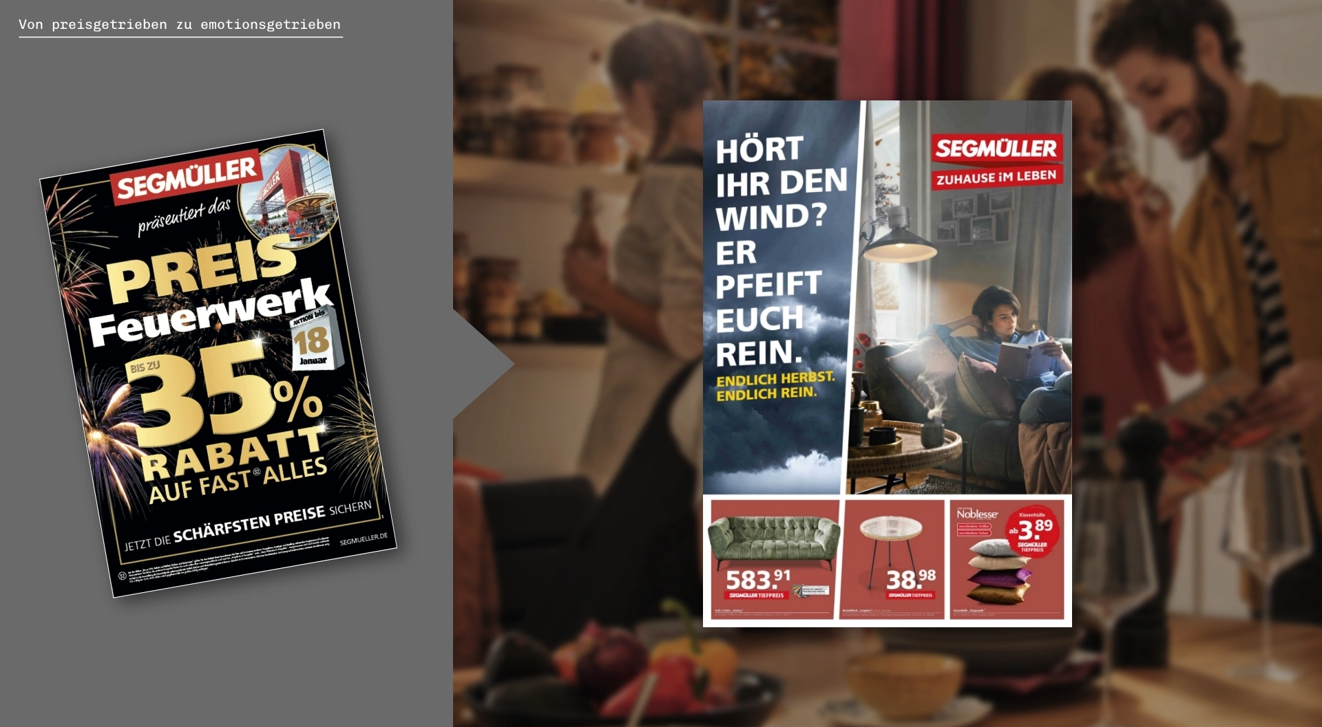 Die Markenkommunikation war stark rabatt- und preisgetrieben und folgte den typischen Mustern des Möbelhaus-Retails. Visuell zeigte sich dies in einer lauten, überladenen Gestaltung mit grellen Farben, Effekten und starkem Fokus auf Prozentkommunikation. Eine klare Differenzierung oder emotionale Ansprache fehlte.